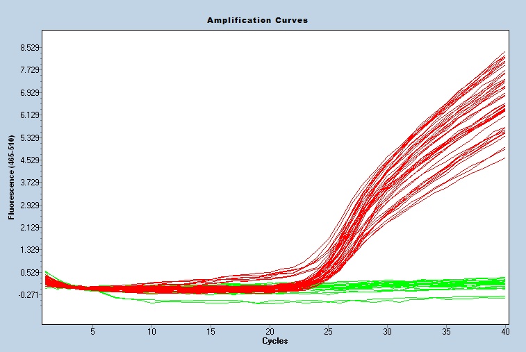 Taqman qPCR protocols are run on a real time PCR instrument. Use an appropriate instrument specific Fluorophore/Quencher combination. The transgene genotype is determined by comparing ΔCt values of each unknown sample against known homozygous and hemizygous controls, using appropriate endogenous references.