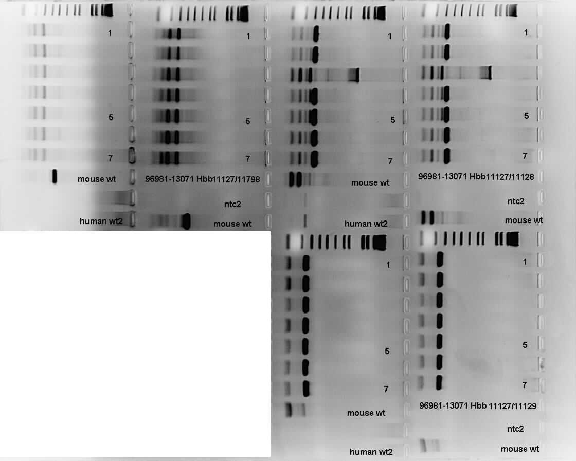 Hbbtm3(HBG1,HBB)Tow (primers:11127/11128) = 320 bp (human WT)