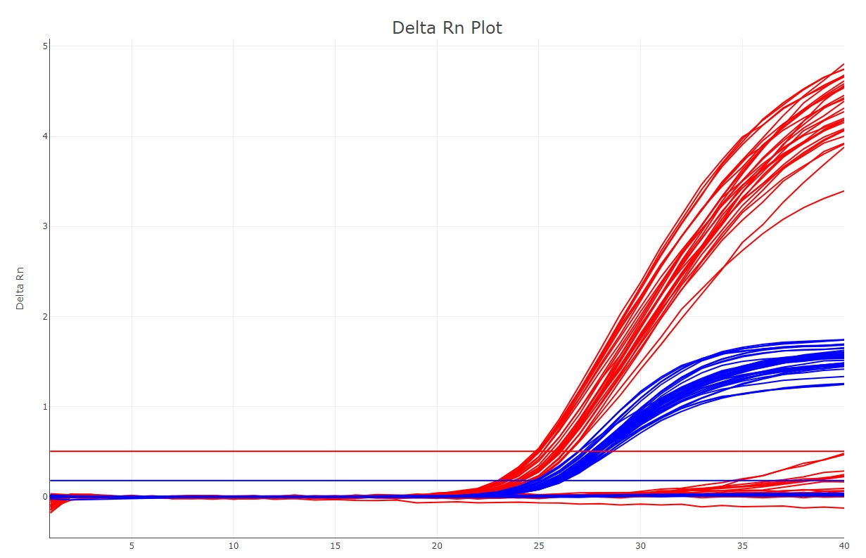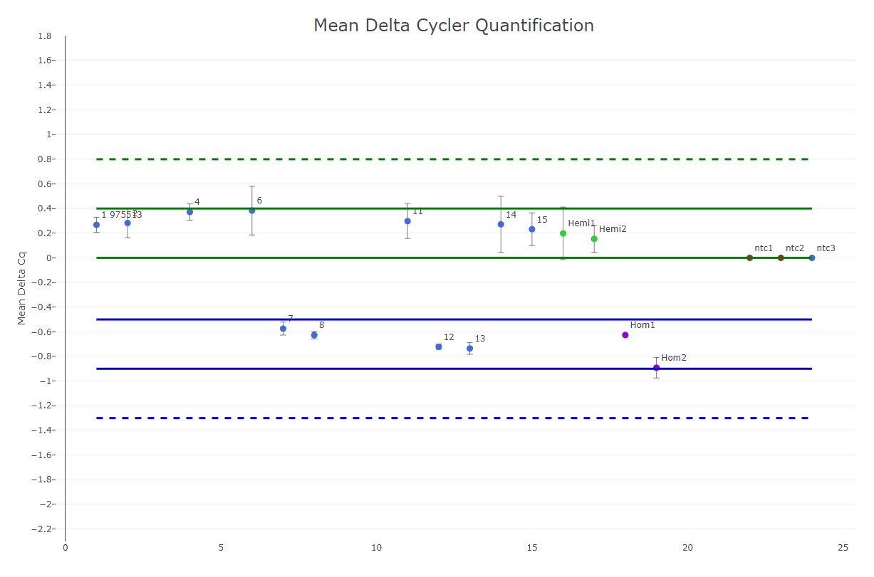 Taqman qPCR protocols are run on an ABI 7500, 7700, 7900 or the Roche LightCycler 480. Use an appropriate instrument-specific Fluorophore/Quencher combination. The transgene genotype is determined by comparing δCt values of each unknown sample against known homozygous and hemizygous controls, using appropriate endogenous references.