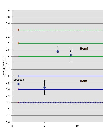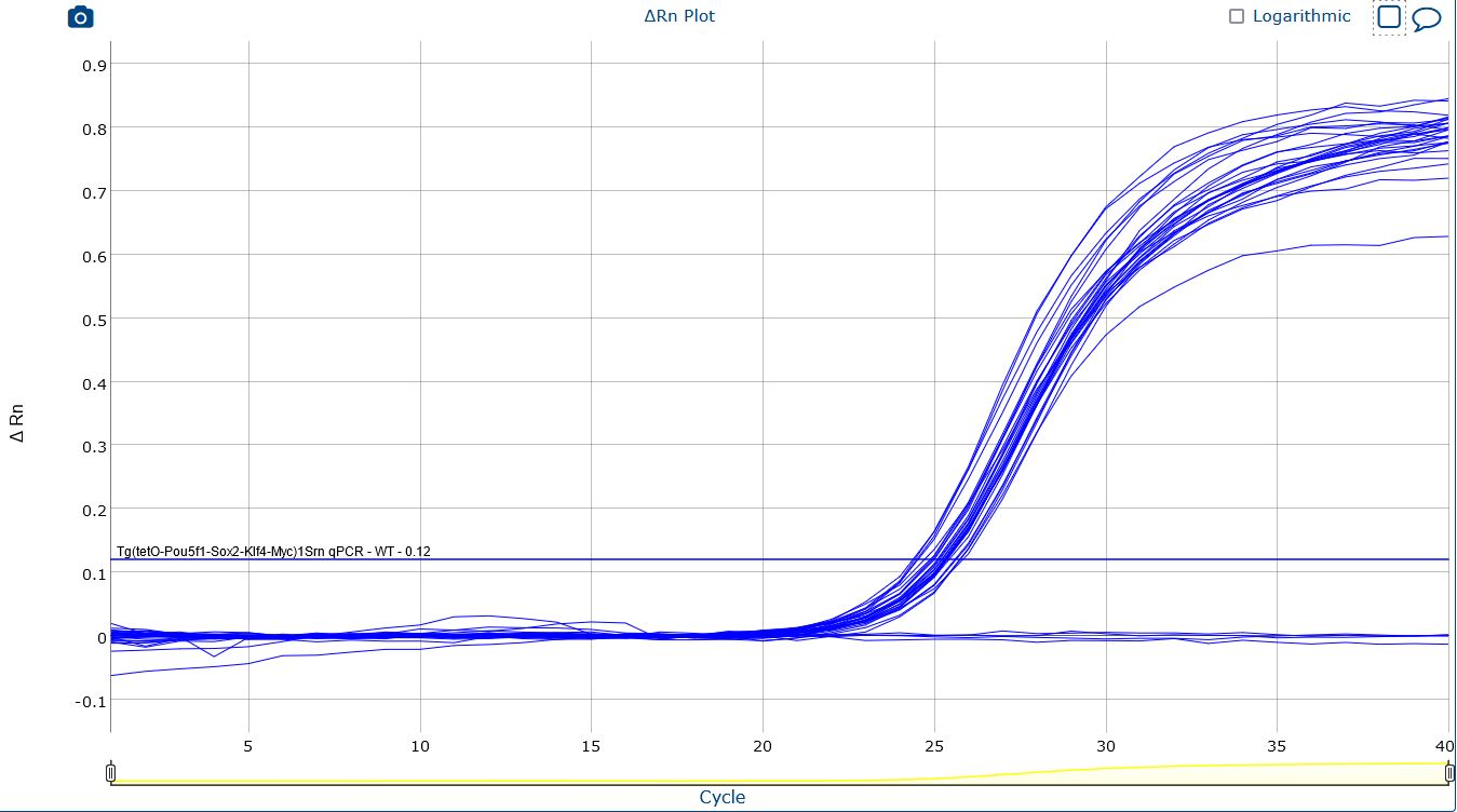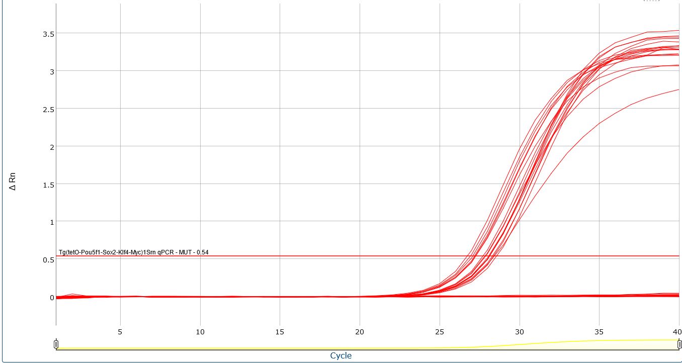 Taqman qPCR protocols are run on a real time PCR instrument. Use an appropriate instrument specific Fluorophore/Quencher combination. The transgene genotype is determined by comparing ΔCt values of each unknown sample against known homozygous and hemizygous controls, using appropriate endogenous references.