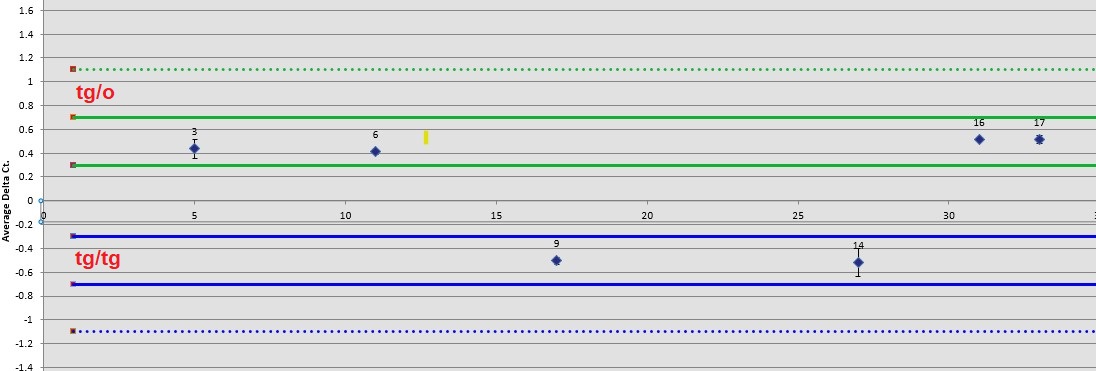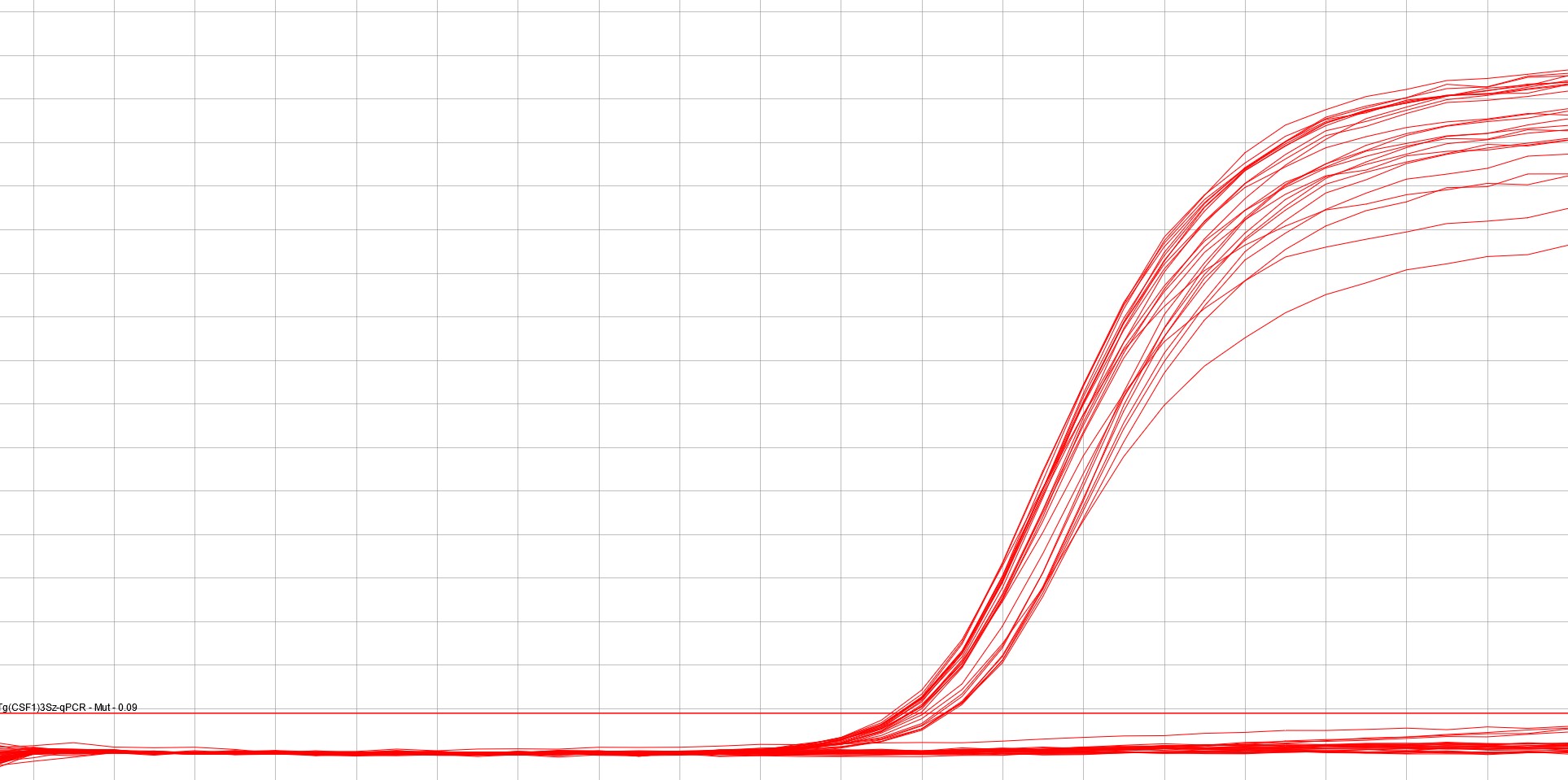 Taqman qPCR protocols are run on a real time PCR instrument. Use an appropriate instrument specific Fluorophore/Quencher combination. The transgene genotype is determined by comparing ΔCt values of each unknown sample against known homozygous and hemizygous controls, using appropriate endogenous references.