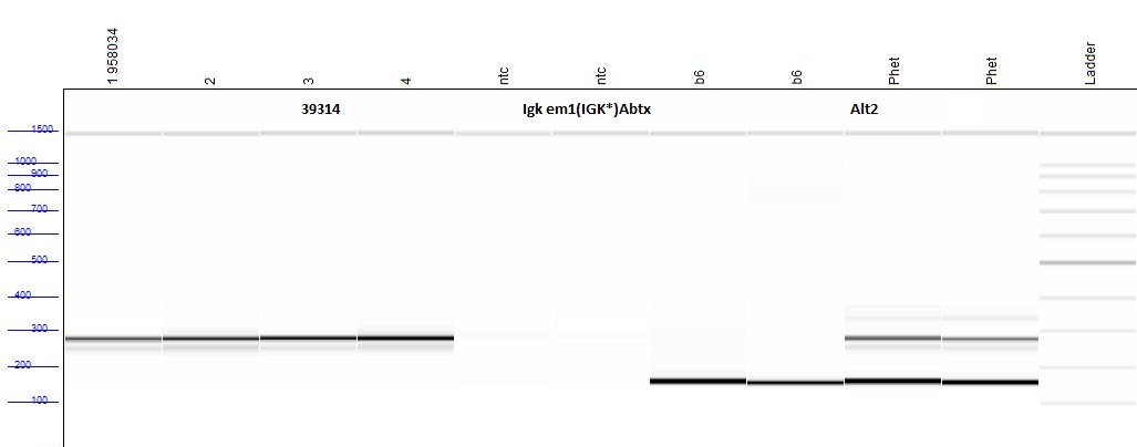 | 74554 | GCA ACC TCT TCT TTA CAA CTG | Wild type Forward | A | Igk/chr6 | ||