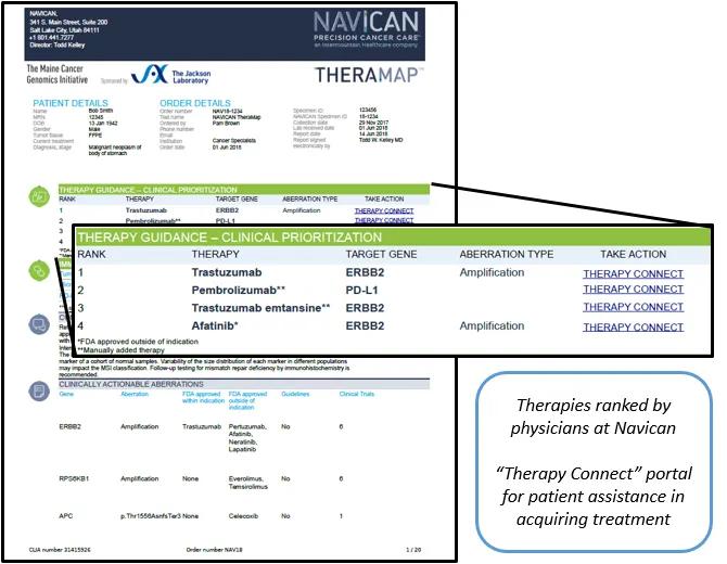 The Maine Cancer Genomics Initiative has recently partnered with Navican, an Intermountain Healthcare organization, to assist in genomic testing while our CLIA lab is working on the next iteration JAX test. The Navican test reports are similar to JAX reports, indicating specific mutated variants and providing treatment options based on these mutations. Navican ranks the top therapies based on molecular tumor boards that they conduct internally prior to releasing the test report. This will NOT replace the JAX/MCGI Genomic Tumor Board, which will remain in place to discuss the more complex cases and the clinical trial options in more detail.