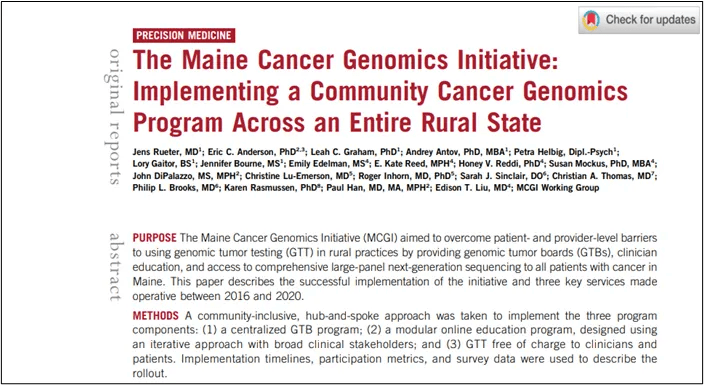 The Maine Cancer Genomics Initiative: Implementing a Community Cancer Genomics Program Across an Entire Rural State highlights the successful integration of clinical genomics and precision oncology throughout the entire rural state of Maine, achieved through the collaborative efforts of the initiative and the local oncology community.
