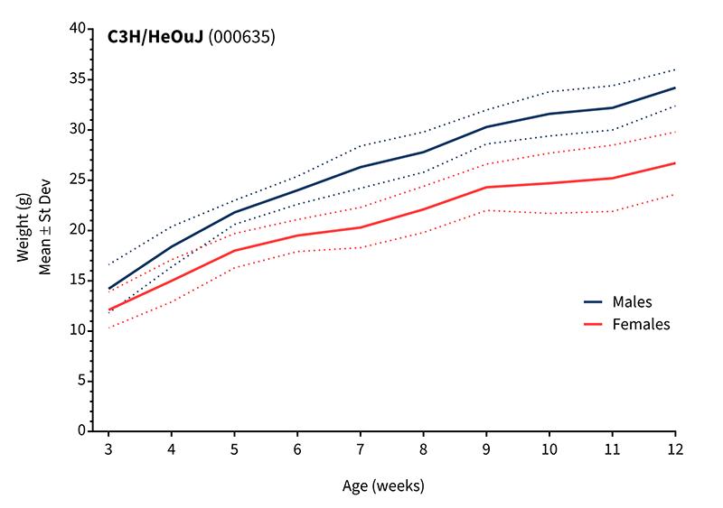 Groups of 30 females and 30 males were weighed weekly. Mice were fed a diet containing 6% fat (LabDiet® 5K52 formulation). Values represent mean and one standard deviation. Ages are ± 3 days.