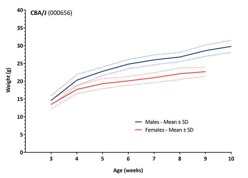 Groups of 40 females and 40 males were weighed weekly. Mice were fed a diet containing 6% fat (LabDiet® 5K52 formulation). Values represent mean and one standard deviation. Ages are ± 3 days.