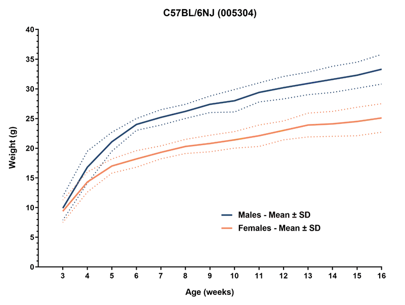 Groups of 80 females and 80 males were weighed weekly. Mice were fed a diet containing 6% fat (LabDiet® 5K52 formulation). Values represent mean and one standard deviation. Ages are ± 3 days.