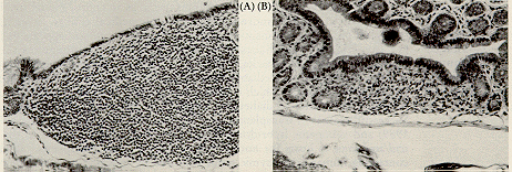 Figure 2. The gut associated lymphoid tissue is prominent in colon of the +/? control (A) while it is almost nonexistent in the scid/scid littermate (B). Background lesions