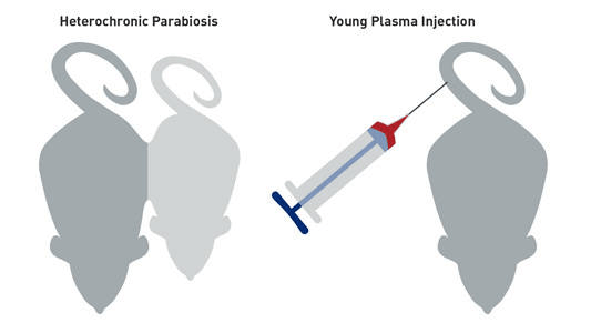Figure1. Schematic illustration of heterochronic parabiosis between a young and old mouse and young plasma injected into an old mouse.