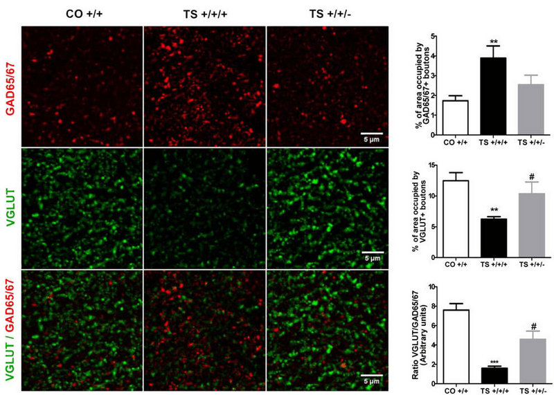 Dyrk1a-corrected DS (TS +/+/-) mice exhibit balanced expression similar to wild-type (CO +/+) of stimulatory (VGLUT) and inhibitory (GAD65/67) synapse markers in the hippocampus compared to DS (TS +/+/+) mice. (PLoS One.2014 Sep 4;9(9):e106572. Reproduced with permission of PLoS One).