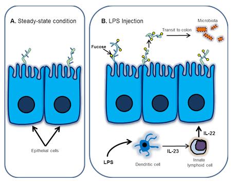 Pickard et al. demonstrated that gene deletion of Fut2 prevents fucosylation in IECs in response to LPS, indicating that Fut2 expression is required for the LPS-stimulated fucosylation seen in IECs following systemic infection. Moreover, they demonstrated that mice lacking Fut2 recover from weight loss more slowly following LPS-induced anorexia than their littermate controls’, suggesting that fucosylation is beneficial to the host under such stressful conditions. This beneficial effect is dependent on the microbiota, because microbiota-depleted (germ-free) mice show impaired weight gain following LPS-induced anorexia, despite normal IECs fucosylation.