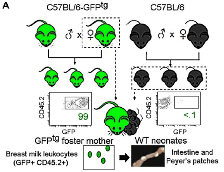 In order to examine where maternally-derived leukocytes reside following transmission to suckling young, Laouar teams performed a number of fostering experiments (Fig 1). First, they fostered wild-type C57BL/6J (000664) pups using mothers that foster mothers express a GFP transgene regulated by the human ubiquitin C gene promoter (C57BL/6-Tg(UBC-GFP)30Scha/J,004353). In these C57BL/6-GFPtg mice, nearly all cells in all tissues express GFP, allowing maternal cells to be visualized easily in non-GFP-expressing wild-type C57BL/6J foster pups. At weaning (21 days), maternal GFP-positive (GFP+) cells were preferentially located in intestinal Peyer’s patches in the foster pups. These small tissues are sites of immune cell development, and have been associated with gut immunity. Very little GFP fluorescence was observed in other tissues in the fostered pups, and once breastfeeding from the GFP+ dams ended, GFP-positivity in the Peyer’s patches rapidly diminished, and was undetectable in adult mice.