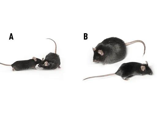 Mouse Models of Type 2 Diabetes. [A] (Left) C57BL/6J are sensitive to diet-induced obesity (DIO). B6 DIO mice (380050) (right) are obese, have slightly elevated fed blood glucose, and are glucose intolerant compared to normal diet controls (left). [B] (Right) B6.Cg-Lepob/J (000632), commonly called ob/ob, compared to a littermate control. The ob/ob mice are overtly obese, have severe hyperinsulinemia, transient hyperglycemia and are glucose intolerant.