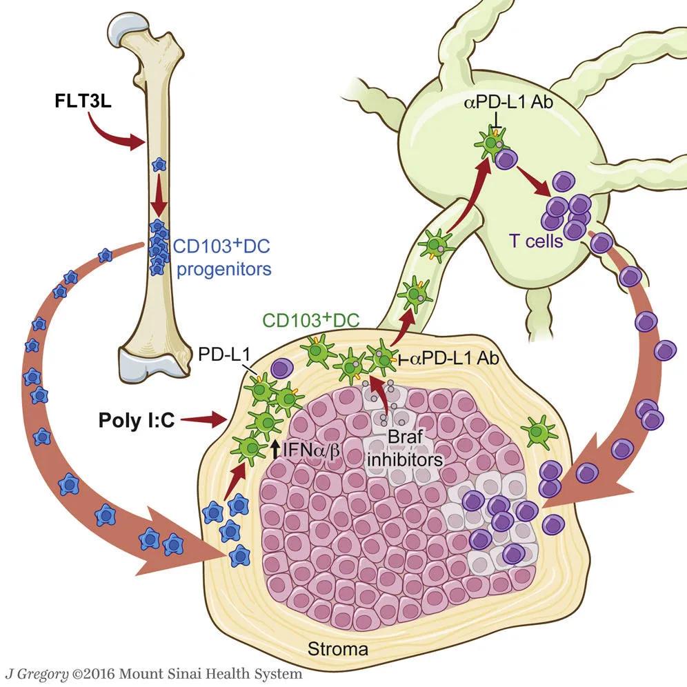 Although checkpoint inhibitor blockade reduced tumor growth in both the B16 and 4-HT-inducible myeloma models, tumor growth was not completely inhibited. The authors hypothesized that increasing the numbers of activated CD103+ DCs in the tumor might enhance the response. Accordingly, they treated tumor-bearing mice with daily injections of the growth factor FMS-like tyrosine kinase 3 ligand (FLT3L). The FLT3L treatment stimulated MHC II+, CD11c+, CD103-, CD11b-, IRF8+ progenitors in the bone marrow to greatly expand CD103+ DCs in the tumors. The DCs, however, must be activated and functionally mature in order to maximally stimulate cytotoxicity in T cells. CD103+ DCs express toll-like receptor 3 (TLR3) that when bound to double-stranded RNA (dsRNA), stimulates cell maturation and interferon type I (IFN1) production. Type I IFN is required for efficient T cell priming. TLR3 also can be activated using the synthetic dsRNA analog polyriboinosinic:polyribocytidylic acid (poly I:C). Therefore, tumor bearing mice from both melanoma models were treated with FLT3L, poly I:C, or both together (FLT3L + poly I:C). As expected, the mice treated with FLT3L + poly I:C showed the most significantly reduced tumor growth in both models. When the experiment was repeated using the B16 cells in Batf3-deficient mice that lack CD103+ DCs, the effect of FLT3L + poly I:C was lost. Altogether, these results further demonstrated the role of CD103+ DC in the priming of T cells with tumor antigens and that strategies for increasing the numbers of activated tumor-infiltrating DCs could enhance immune-mediated tumor killing.