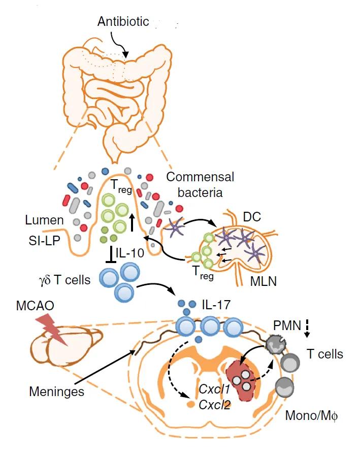 Figure. Schematic of a proposed mechanism by which antibiotic-induced dysbiosis leads to improved outcomes in stroke. Dendritic cells induce Treg cells, which suppress IL-17+ γδ T cell differentiation and proliferation. Following stroke, fewer effector T cells traffic from gut to the meninges. The reduced numbers of IL-17+ γδ T cells also reduces the numbers of infiltrating immune cells, which reduces damage following ischemic injury. DC, dendritic cell; MLN, mesenteric lymph node; PMN, polymorphonuclear neutrophils; SI-LP, small intestine-lamina propria; MCAO, middle cerebral artery occlusion; Mono/Mφ, monocyte/ macrophage; (Adapted from Benakis et al., 2016.)