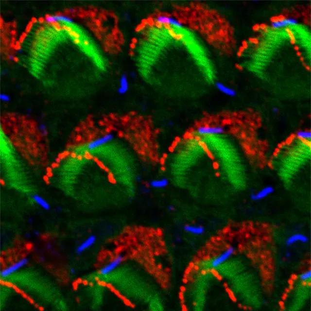 Three rows of hair cells are shown. Here one of the proteins is in red, with dots being stereocilia (green) tips, and crescents the bare zone. In blue is the unique primary cilium in each cell.