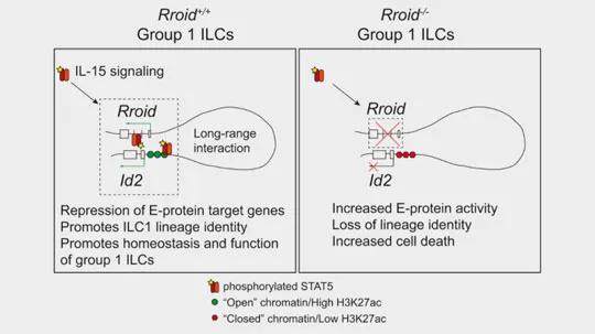Through a complex series of steps, the Rroid locus specifically regulates chromatin accessibility and transcription factor binding at the Id2 promoter. Without the Rroid locus, progenitor cells were able to commit to ILC1 lineage, but later development and maturation of ILC1 group cells was blocked. This indicates that maintenance of lineage identity in ILC populations is controlled by specific epigenetic regulatory elements at the Id2 locus, with Rroid playing a vital role in ILC1 function.