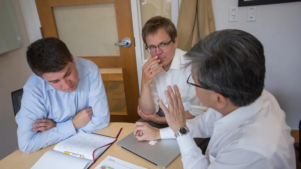 Oncologist Rachit Kumar, M.D., is deep in discussion about his patient with stage 4 pancreatic cancer that had metastasized to multiple organs. Around the conference room table and on the speakerphone, fellow oncologists and experts in cancer genomics and clinical trials discuss the genetic profile of the patient’s cancer, weighing in on advanced treatment options, as a genetic counselor and two student interns take notes.