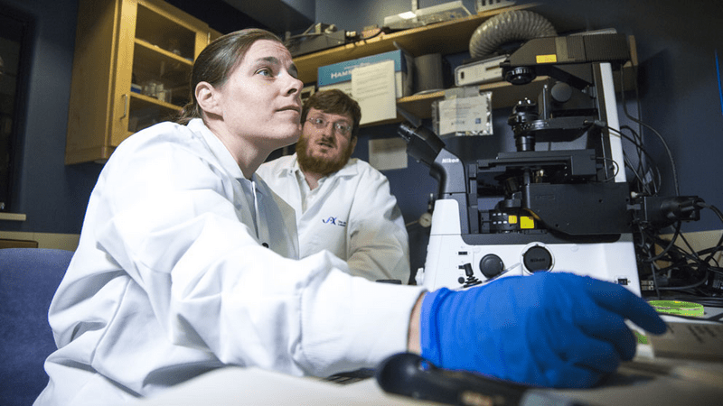 Alzheimer's researchers Catherine Kaczorowski and Philipp Heinrich. JAX photo taken pre-COVID-19 by Tiffany Laufer.