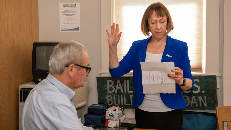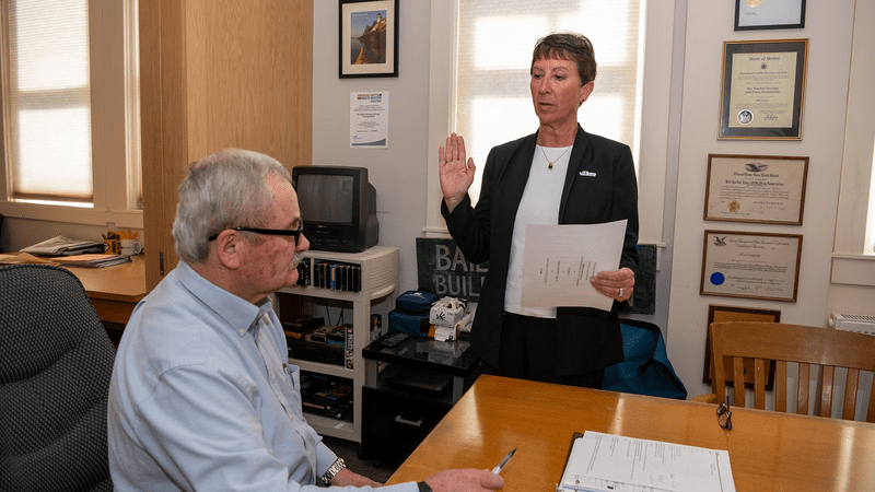 JAX employee LuAnn Ballesteros being sworn in. Dedimus Justice duties were performed by Bill Weir, president and CEO, Bar Harbor Savings and Loan.