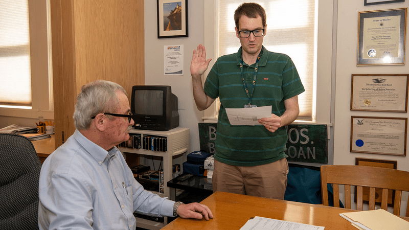JAX employee Catherine "Katy" Longley being sworn in. Dedimus Justice duties were performed by Bill Weir, president and CEO, Bar Harbor Savings and Loan. (Photo credit Tiffany Laufer)