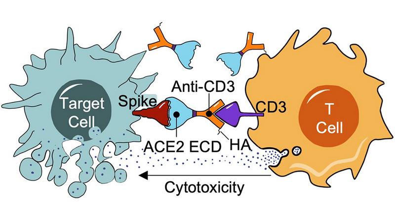 While Spike-protein CAR-T cells boast robust bandwidth to eliminate infected cells, Unutmaz and his lab went one step further to provide an alternative antibody-based immunotherapy. Unutmaz engineered a bispecific antibody fused with a domain of ACE2 to activate a patient’s own T cells to destroy infected cells with surface SARS-CoV-2 Spike protein on the surface. The antibody-receptor complex triggered effective T cell activation and targeted killing of Spike+ cells. The approach has the potential to be effective at early stages of infection and, importantly, also at later stages when antibody immune defenses have been breached and T cells are needed to reduce further viral spread.