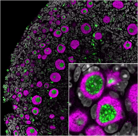 Image of mouse ovary after treatment with chemotherapy drug cisplatin which causes abundant DNA damage in oocytes of primordial follicles. Oocytes are labeled in magenta and DNA damage is marked in green.