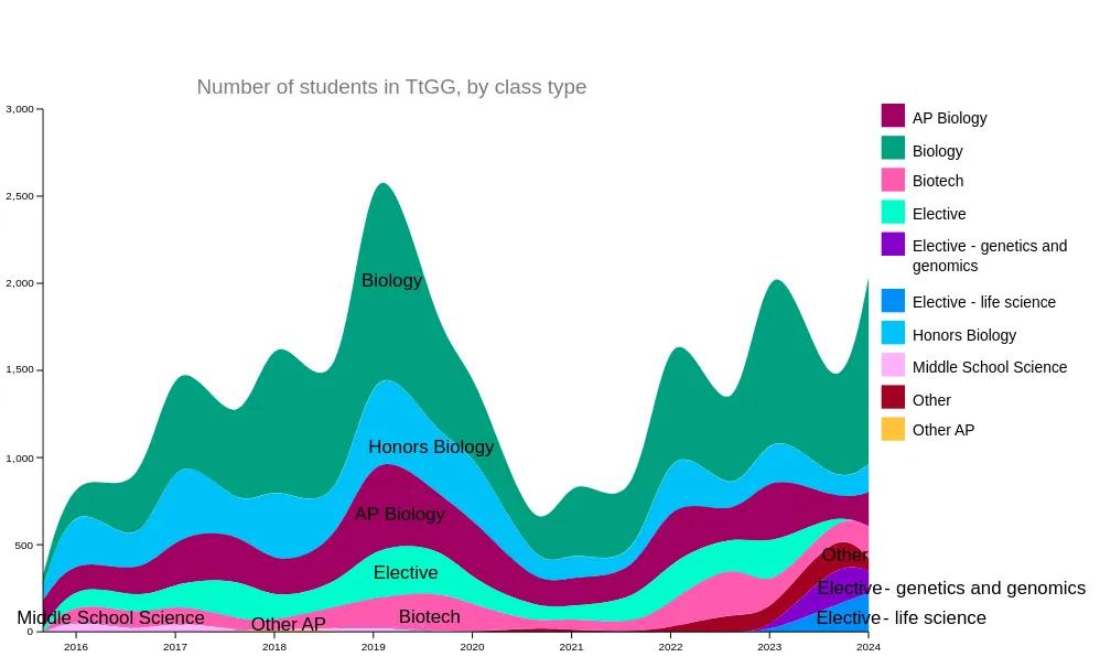 Since its launch in 2014, Teaching the Genome Generation™ has made a significant impact on high school teachers and students. The pilot program successfully trained 47 teachers and reached 1,200 students in its first two years. A decade later, the TtGG™ program boasts more than 310 trained educators and nearly 25,000 students impacted across nine states.