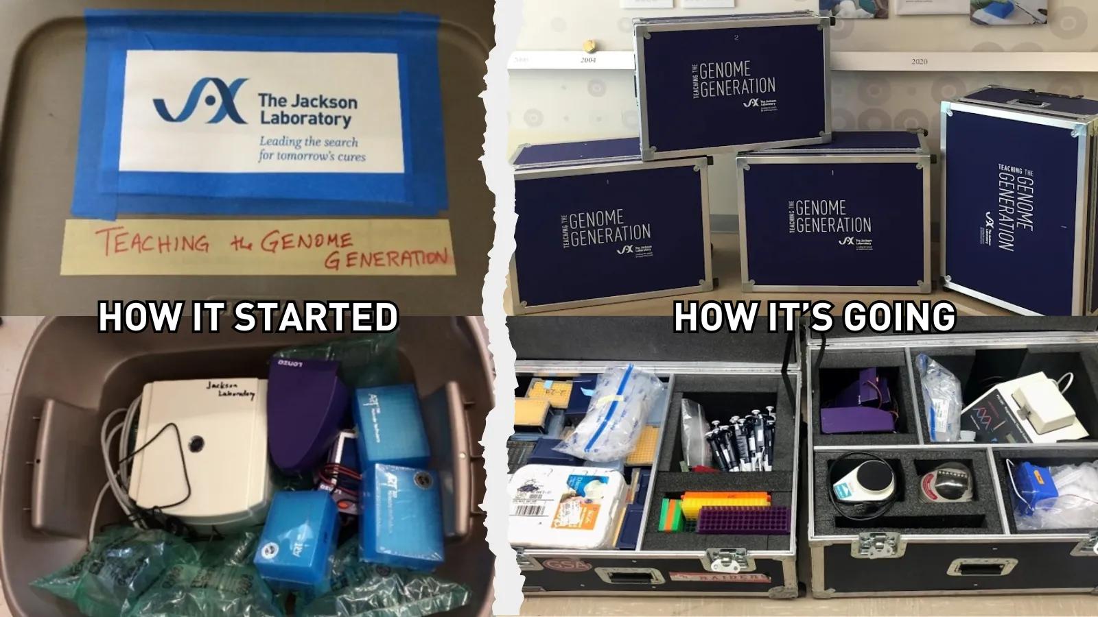 Picture this: It’s 2014 and JAX is piloting a fresh approach to genetics education. To provide an authentic laboratory experience to high school students in rural Maine, JAX staff partner with teachers to train them in a modern genetics curriculum developed by JAX Genomic Education. Lab equipment and reagents are loaded into plastic bins and delivered as makeshift mobile lab kits so students gain hands-on experiences in molecular methods involved in isolating, amplifying and detecting DNA. This is the inception of Teaching the Genome Generation.