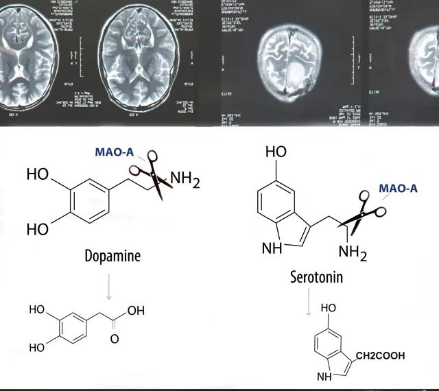 Monoamine oxidase A (MAO-A) is an enzyme that normally functions in neuronal mitochondria by breaking down several key neurotransmitters: serotonin, dopamine and norepinephrine which are important in aggression, emotion and cognition (Figure 1). TheMAOA gene –located in the X chromosome- is also known as the warrior gene, since abnormal versions of the gene often result in aggressive behaviors.