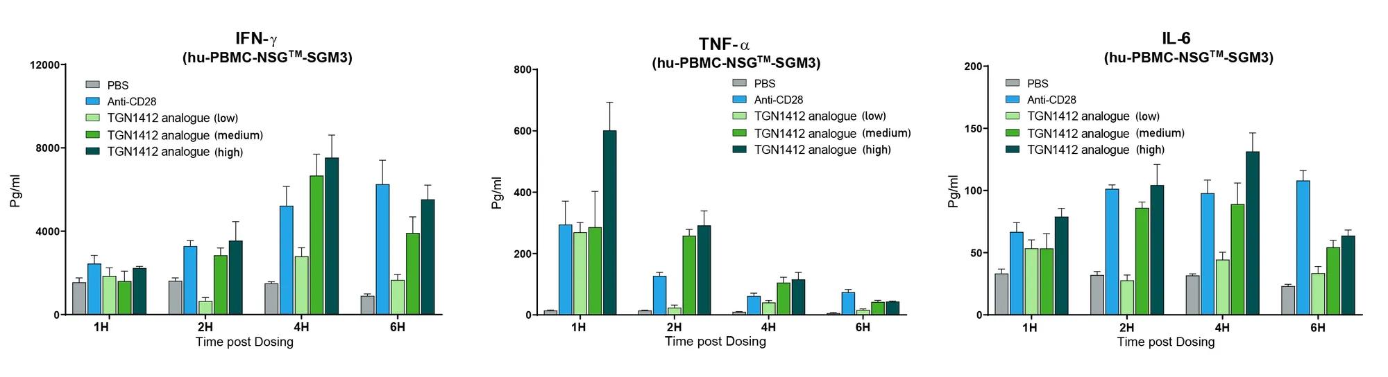 Human PBMCs can be reliably engrafted into highly immunodeficient NSG™ mice (stock # 005557). Human PBMC-engrafted mice were tested for human immune cell-mediated CRS response by treating them with a wide range of monoclonal antibodies (mAb), some of which are clinically known to induce CRS (CRS positive group) and others that do not. The CRS positive group included a biosimilar to TGN1412 (anti-CD28 superagonist mAb), Muromonab (OKT3, anti-CD3 mAb), an alternate anti-CD28 mAb and Thymoglobulin (ATG). The group of drugs known to have no or minimal CRS response included Pembrolizumab (anti-PD1 mAb) and Rituximab (anti-CD20 mAb). Mice were treated six days after human PBMC engraftment and serum was collected at hourly intervals after treatment to perform quantitative human cytokine analysis. All mAbs in the CRS positive control group exhibited hyper-elevated levels of human IFN-ɣ, TNF-α, IL-2, IL-4, IL-6, and IL-10. Cytokine levels in the CRS negative group were similar to those in the PBS-treated control group. In order to further ensure the observed responses were drug mediated, TGN1412 analogue was tested at three doses and compared to the anti-CD28 positive control. TGN1412 analogue demonstrated a clear escalating dose-response of increased cytokine production across all time points examined (figure 1).