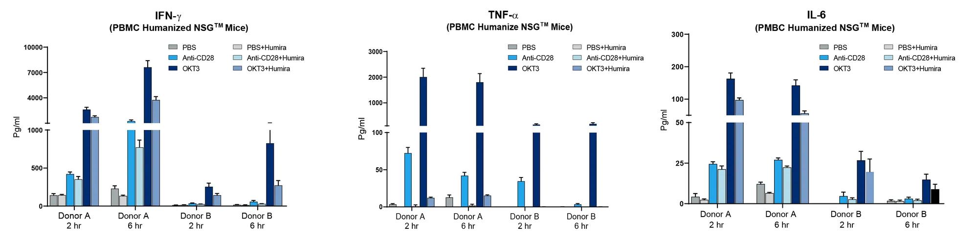Figure 3. Humira (anti-TNF-α mAb) diminishes CRS response in PBMC humanized mice. Two different human PBMC donors (A&B) were engrafted into NSG recipient mice (stock# 005557) and treated with Muromonab (OKT3, anti-CD3 mAb) or anti-CD28 mAb alone or combined with Humira. Human IFN-ɣ, TNF-α, and IL-6 were measured quantitatively in peripheral blood at 2 and 6 hours post treatment. Humira nearly eliminated TNF-α and diminished IFN-ɣ and IL-6.