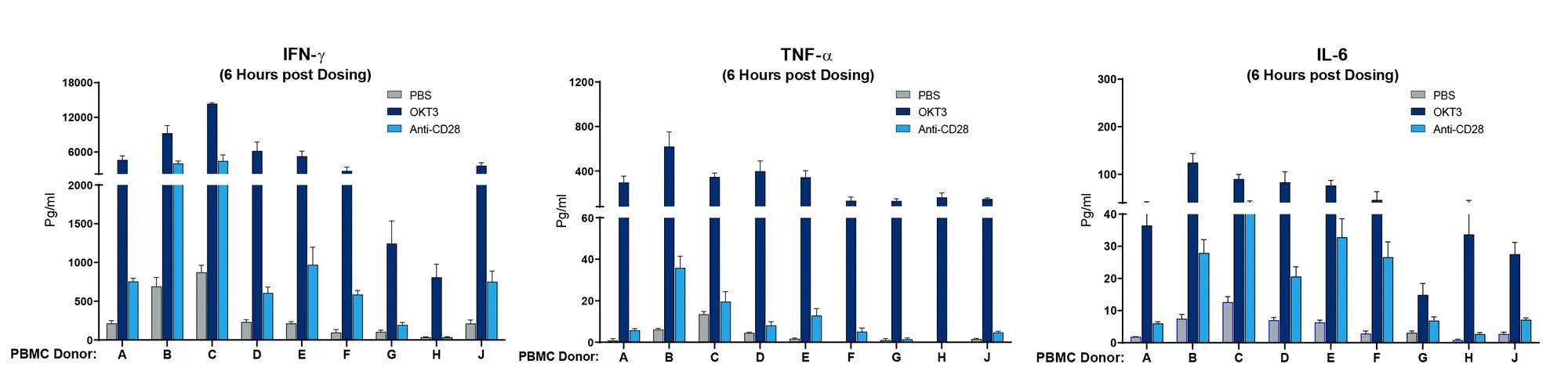 Figure 2. Human PBMC donor specific differences in magnitude of CRS response. Human PBMC from 9 different donors (A-J) were engrafted into NSG recipient mice (stock# 005557) and treated with Muromonab (OKT3, anti-CD3 mAb) or anti-CD28 mAb. Human IFN-ɣ, TNF-α, and IL-6 were measured quantitatively 6 hours post treatment. Each donor shows a quantitative difference in cytokine response to each drug tested.