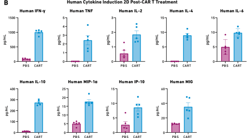After PBMC injection and subsequent administration of CAR T cells or control treatments, researchers can monitor the health of each mouse by serially measuring body weight and temperature and quantifying human cytokines at key time points. At the end of the experiment, scientists can also obtain tissue samples to study organ infiltration, liver toxicity, cardiotoxicity, neurotoxicity, and other downstream effects. The PBMC-humanized mice also accept tumor engraftment, making it possible to simultaneously study toxicity and efficacy by measuring tumor growth inhibition and other markers. In fact, the presence of the tumor and its target molecule is often necessary to initiate cytokine mediated systemic toxicity.