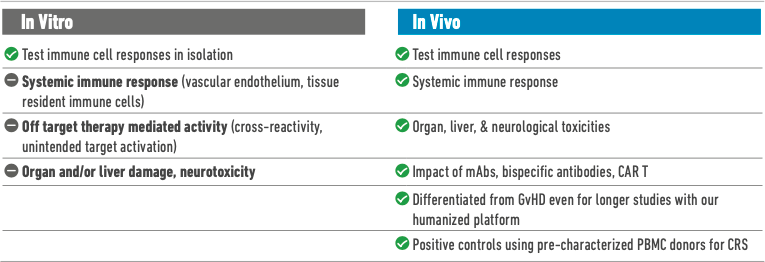 Unlike in vitro studies, in vivo models can approximate the downstream outcomes of systemic adverse responses, allowing researchers to study organ effects and measure health indicators such as overall change in body weight. In the past, however, preclinical studies in mice, non-human primates, and other animals have failed to predict dangerous CRS responses that were later observed in human trial subjects, because a severe immune response can sometimes be tied to the expression of a receptor that is unique to human immune cells.2