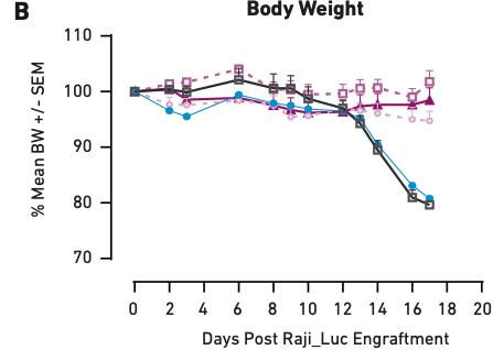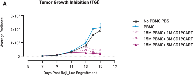 Figure 1A demonstrates that as CAR T cell dose increases from one million cells to five million cells, tumor growth inhibition also increases, showing a correlation between therapeutic dosage and reduction in tumor growth. Similar correlations have been observed in clinical applications of CAR T cell therapies; therefore, the mice accurately modeled direct outcomes. The same is true of health effects—Figure 1B shows that the mice that did not receive CAR T cell treatment (PBS and PBMC only) experienced significant tumor burden-induced weight loss, while the three CAR T cell therapy arms of the study showed little or no loss of body weight, consistent with the aforementioned impact on tumor growth. Together, these data demonstrate that PBMC-humanized mice exhibit dose-dependent responses to CAR T cell therapies that are in line with clinical expectations.