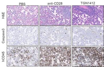 Figure 2. Effect of the treatment of PBMC humanized mice with the CD28 superagonist drug TGN1412. An example of the time course of two pro-inflammatory cytokines is shown in a) and b). The identity of the cytokine is shown above the bars. The horizontal axis shows the hours post-drug treatment, while the vertical axis represents the pg/ml detected in the blood of the treated animals. The green bars correspond to the negative control (injection of the vehicle). The panels on the right (c) illustrate representative examples of lung tissue sections collected from humanized mice treated with the vehicle (PBS), a positive control (anti-CD28) and TGN1412 10 days post-treatment. The stainning is indicated on the side of the panels. H&E (hematoxylin and eosin) staining shows numerous tissue-infiltrating cells. Human CD45 staining confirm that the cells infiltrating the tissue are human immune cells. Caspase 3 staining reveals active apoptosis in the tissue. A pathology analysis confirms the tissue damage induced by TGN1412 (not shown).
