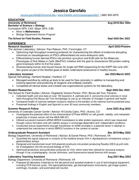 As a research assistant in the Robson Lab, my main research focus is optimizing our high throughput screening protocols for testing endocrine disrupting chemicals (EDCs) on iPSCs differentiated into extra-embryonic cells. The goals of this project are to characterize the effects of EDCs on the steroidogenesis processes within the primitive syncytium cells using morphological and metabolomic screening. In this position, I am additionally responsible for conducting experimental work for research occurring within the lab. Some of these projects include working for the KAPP-Sen Tissue Mapping Center as part of the SenNet goals to better understand senescence in healthy human tissues, in addition to the Molecular Phenotypes of Null Alleles in Cells (MorPhiC) initiative with the goal to knockout 250 protein-coding genes in human iPSCs within its first five years. Through these projects, I am continuing to gain additional research skills in a variety of methods to better prepare for my eventual pursual of a PhD.