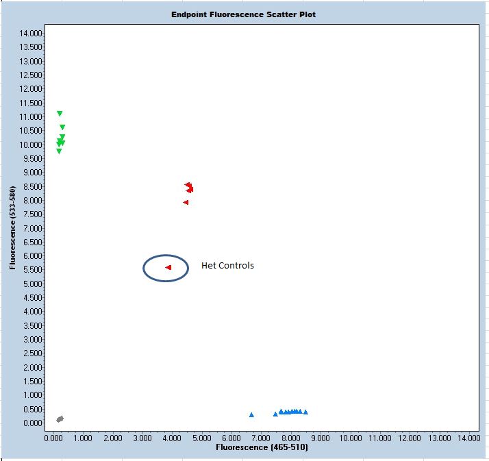 Taqman qPCR protocols are run on a real time PCR instrument. Use an appropriate instrument specific Fluorophore/Quencher combination. The transgene genotype is determined by comparing ΔCt values of each unknown sample against known homozygous and hemizygous controls, using appropriate endogenous references.