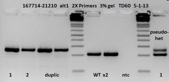 Heterozygote = 207 bp and ~270 bp