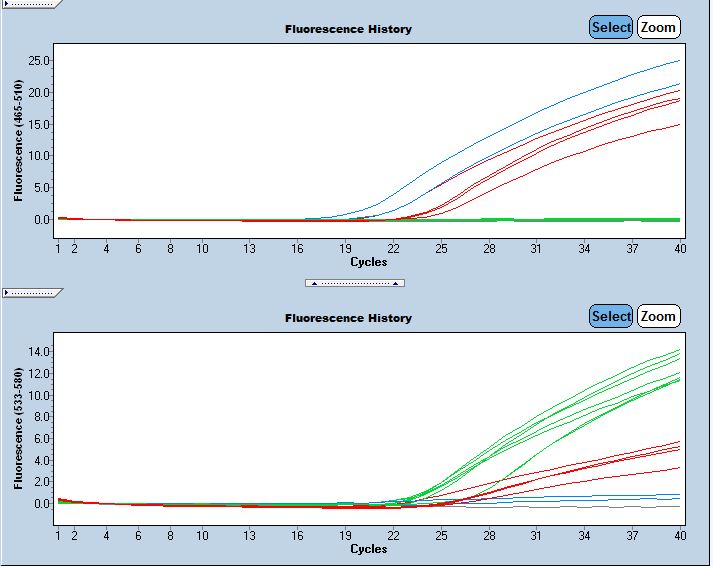 Taqman qPCR protocols are run on a real time PCR instrument. Use an appropriate instrument specific Fluorophore/Quencher combination. The transgene genotype is determined by comparing ΔCt values of each unknown sample against known homozygous and hemizygous controls, using appropriate endogenous references.