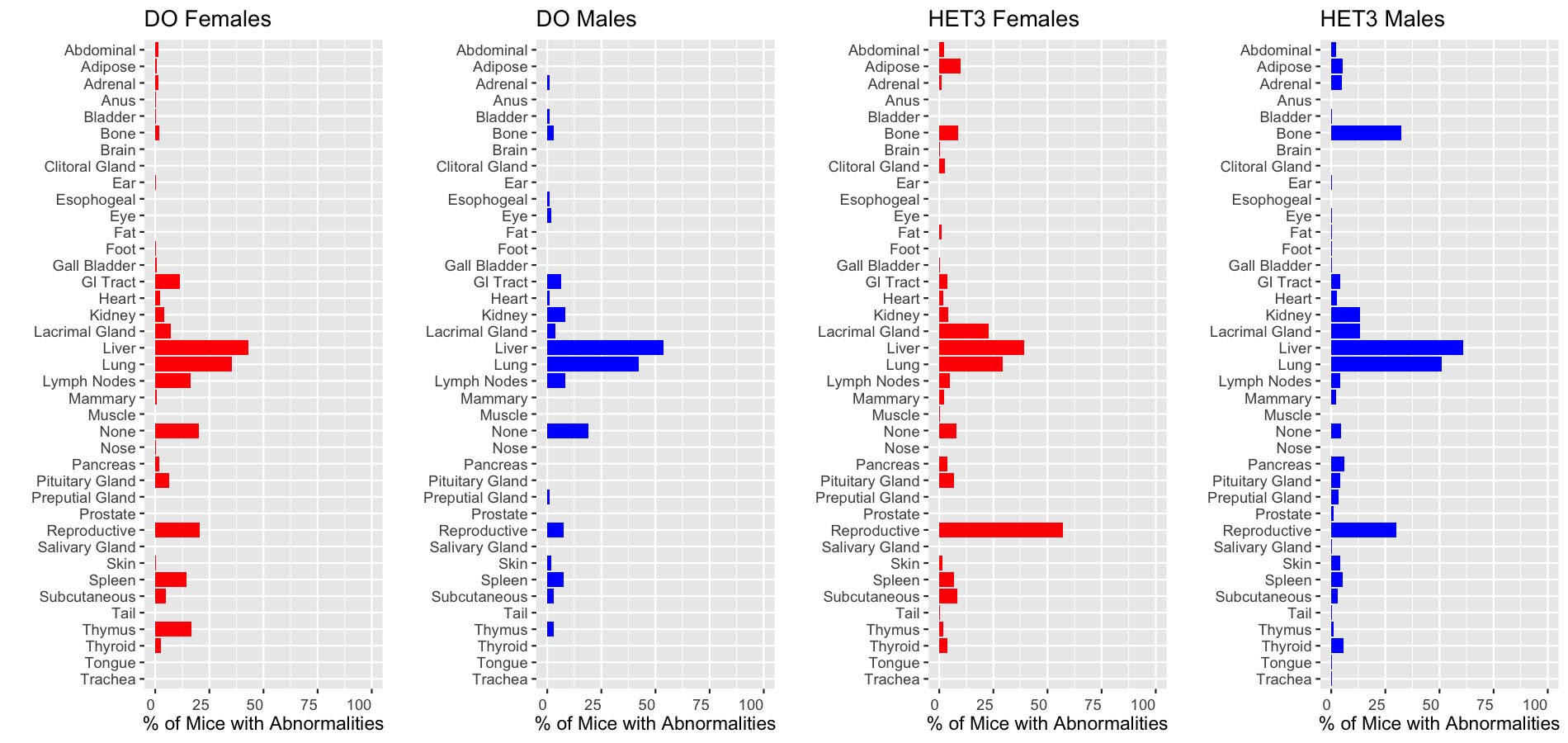 One interesting, early observation is that while we see predominantly liver tumors (in 46% of DO and 49% of UM-HET3, males and females combined) and lung tumors (in 37% of DO and 39% of UM-HET3, males and females combined) at 24 months of age, the most frequent tumors in female UM-HET3 mice are in the reproductive system (Figure 2).